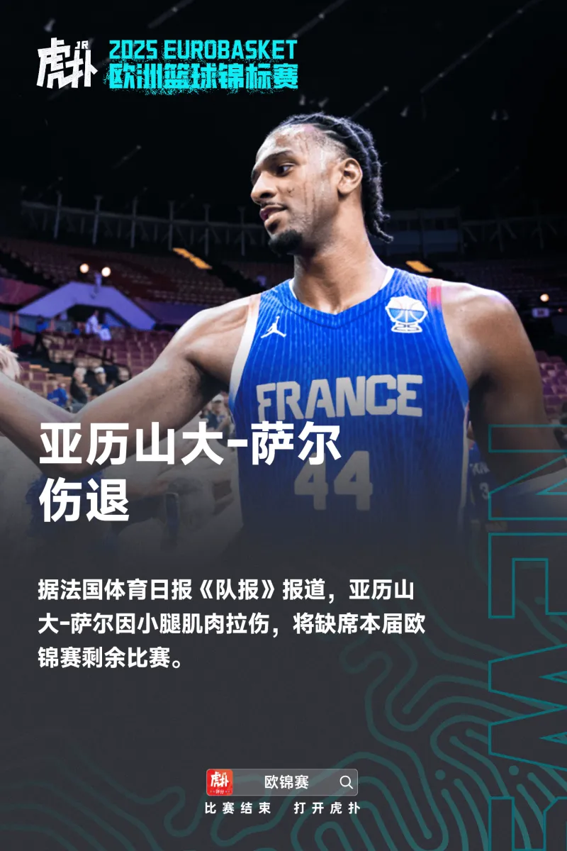 此前,在法国103-95战胜斯洛文尼亚的比赛中,萨尔遭遇了肌肉拉伤,但许多人压根未注意到,预计将缺席数周。